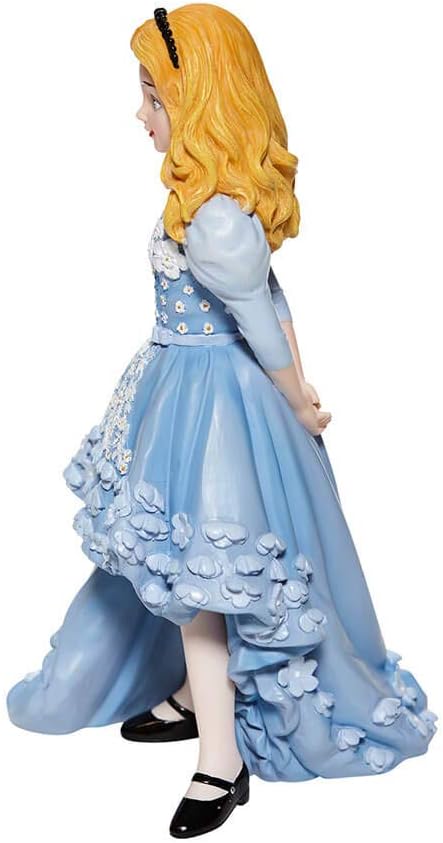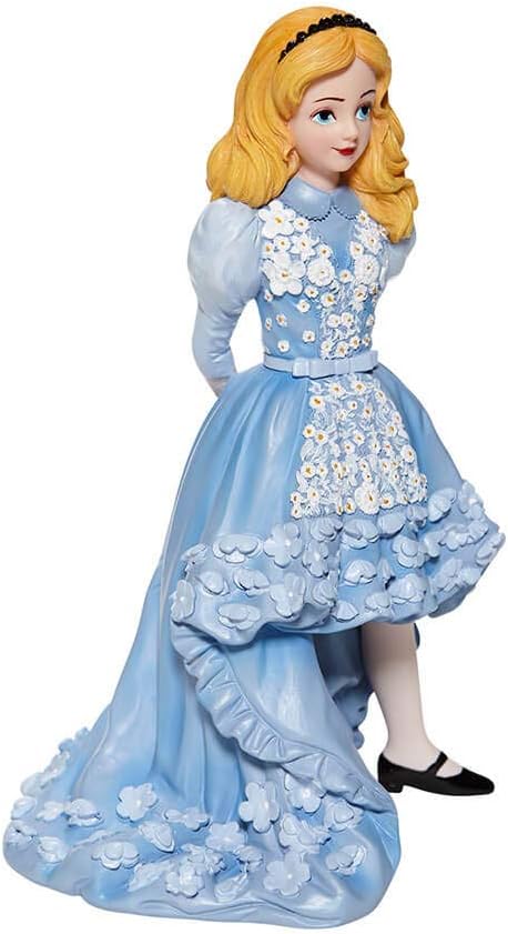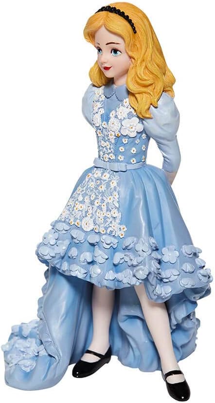 - Celebrate the 70th Anniversary of Walt Disney’s animated classic Alice in Wonderland with this Alice figurine in an updated, stylish outfit as never before seen! Alice’s signature cerulean blue knee-length dress with white pinafore apron is transformed into an elegant ensemble. Floral ruffles and figural white daisies now embellish the dress, evoking iconic film scenes. Classic costume elements including black strapped Mary Jane shoes over white stockings root this stunningly fresh interpretation in Disney animation history. All hand-crafted and hand-painted, the curious and imaginative Alice is the talk of Wonderland in her fashion forward tea party dress. This figurine is part of the Disney Showcase Couture de Force Collection from Enesco.