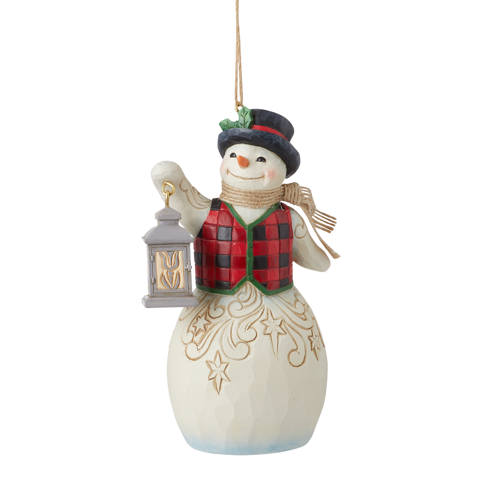 Guiding the way home to turkey and mistletoe, this smiling snowman holds a lantern in a buffalo plaid vest and holly brimmed top hat. With dazzling Jim Shore rosemaIling and billowing scarf, he extends affection from his carrot nose