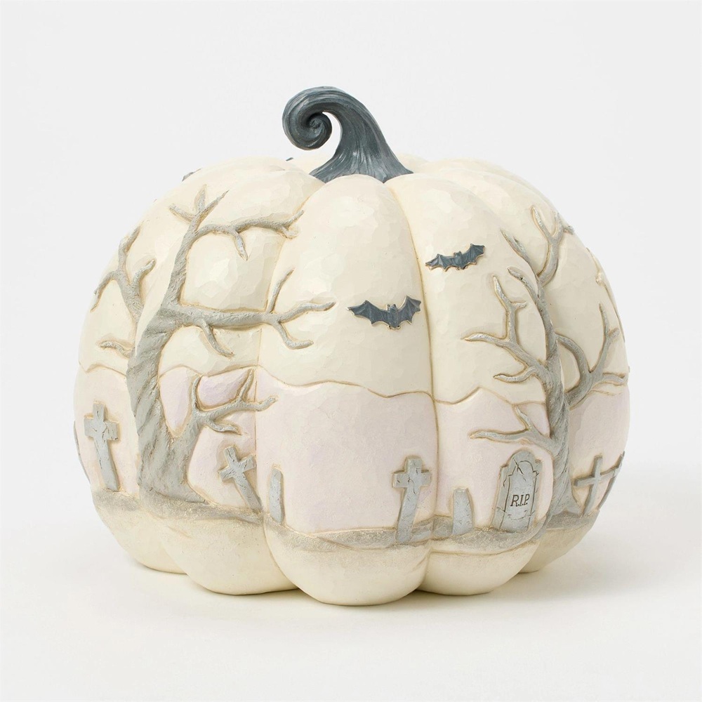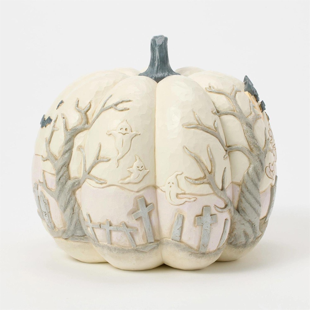 Capture the spirit of Halloween with this eerie white Jim Shore pumpkin figurine, showcasing a haunted graveyard scene complete with a spooky haunted house, flying bats, and a full moon. With intricate details and haunting ambiance, prepare to scare!