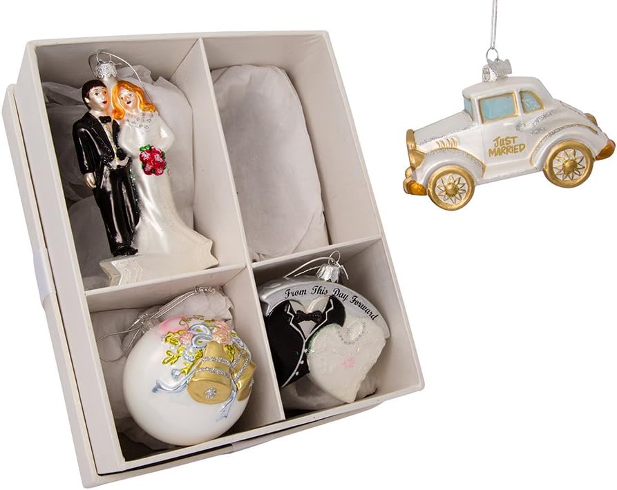This Noble Gems Wedding Ornament from Kurt Adler is the perfect wedding gift, sure to be treasured by the happy couple year after year. These ornaments feature wedding icons with glittery accents including a bride and a groom, a white antique car that says, “Just Married,” a set of golden wedding bells that say, “Mr. and Mrs.” and bride and groom-style hearts that say, “From This Day forward.” The ornaments come packed in a white gift box set. A perfect wedding gift for the newly married couple!